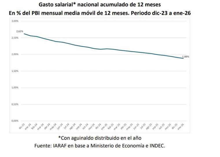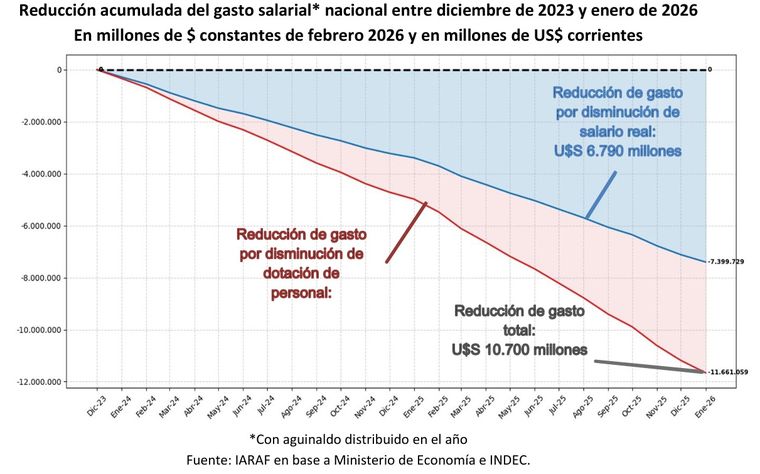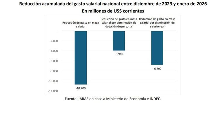 El último informe del Instituto Argentino de Análisis Fiscal (Iaraf) muestra que durante el mandato de Javier Milei (diciembre 2023-enero 2026) la reducción acumulada del gasto salarial del sector público nacional no financiero fue equivalente a US$10.700 millones, explicado en un 37,5% por la reducción de planta y el 62,5% por la reducción del salario real. Impacta este último porcentaje en relación con la pérdida de poder de compra de los empleados y empleadas del sector público.