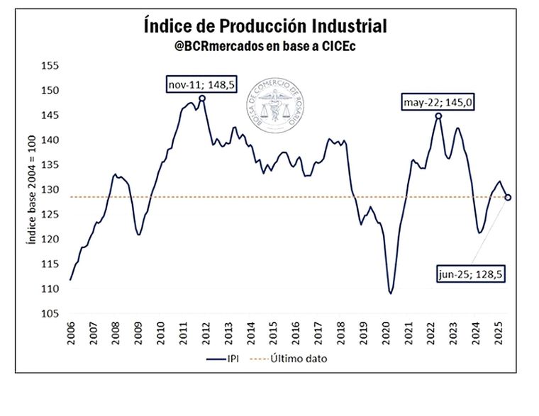 Noticias ArgentinasLa industria frenó su recuperación y acumuló cuatro meses seguidos de caída. Entre marzo y junio, de los 16 sectores que componen el Índice de Producción Industrial Manufacturero del INDEC, sólo 4 registraron una variación positiva. Según el análisis de la Bolsa de Comercio de Rosario, tomando como referencia el Índice de Producción Industrial (IPI) elaborado por el Centro de Investigación del Ciclo Económico (CICEc), a partir de marzo el sector muestra dificultades en sostener el crecimiento que tuvo en los últimos meses de 2024 y el primer bimestre del año.