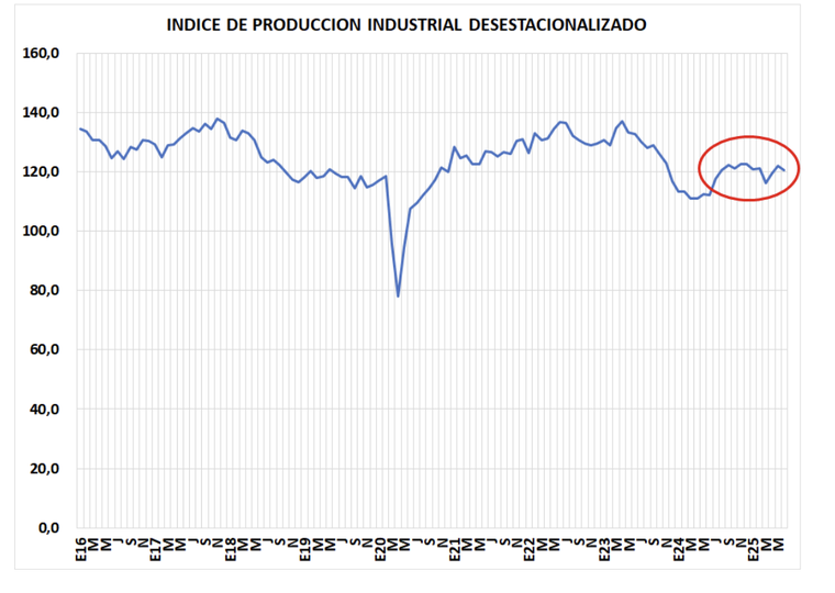 El gráfico 1 muestra el índice de producción industrial desestacionalizado. El primer dato que se observa es que la producción industrial está estancada desde diciembre pasado. Es decir, lleva seis meses de estancamiento.