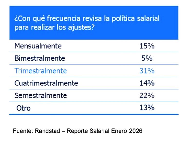 El estudio también analizó la periodicidad con la que las empresas revisan sus políticas salariales. El 31% de las organizaciones realiza ajustes trimestrales, mientras que el 22% lo hace de manera semestral. En tanto, el 15% aplica revisiones mensuales, el 5% bimestrales y el 14% cuatrimestrales. Un 13% utiliza otros esquemas.