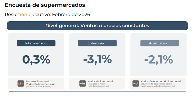 Las ventas en autoservicios mayoristas, por su parte, mostraron en febrero una caída del 1,2% interanual, mientras que el acumulado del primer bimestre presentó una leve suba del 0,1% respecto a igual período de 2025. En la medición desestacionalizada, el índice registró una baja del 0,7% mensual.