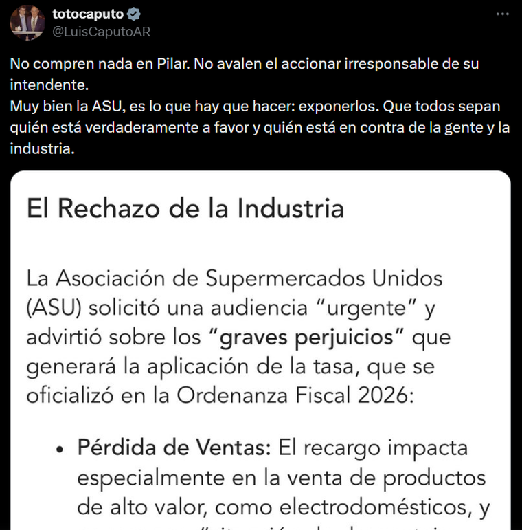 "No compren nada en Pilar. No avalen el accionar irresponsable de su intendente", lanzó Luis Caputo a través de redes sociales.