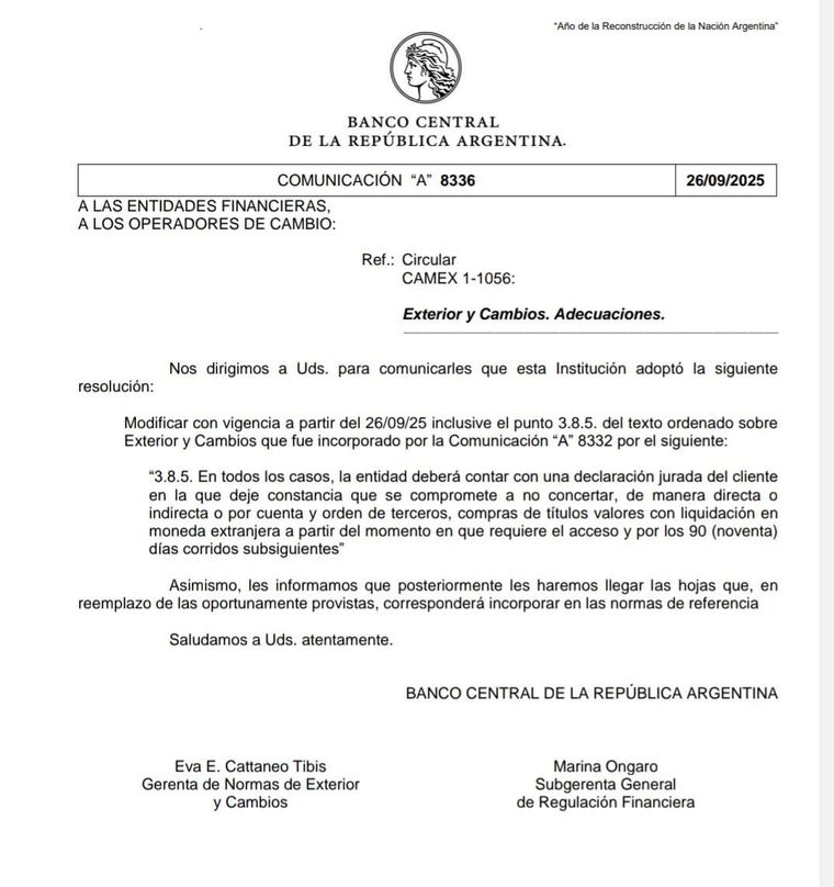 El Banco Central estableció que quienes adquieran dólares al tipo de cambio oficial no podrán operar en los mercados financieros, reforzando las restricciones cambiarias y limitando el acceso a divisas para ahorro o inversión.