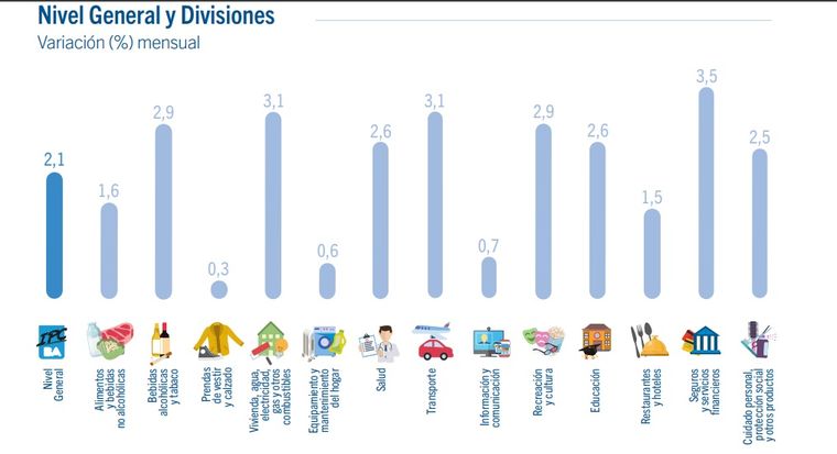Los rubros que marcaron el alza del índice por sobre las mediciones anteriores fueron Servicios y Seguros Financieros con un 3,5%, Transporte 3,1%, Vivienda, agua, electricidad y gas 3,1% y Bebidas alcohólicas y Tabaco 2,9%.