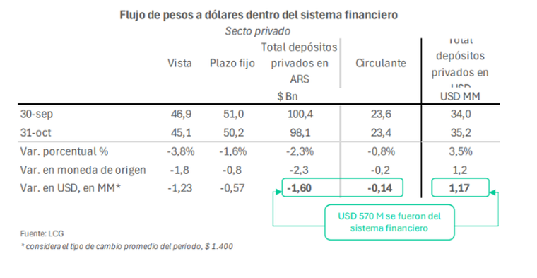 De acuerdo a un informe de LCG, la contracara de la suba de los depósitos en dólares fue la reducción de los depósitos en pesos. Medidos contra el 30/9, el desarme de tenencias en pesos fue por US$1.700 millones.