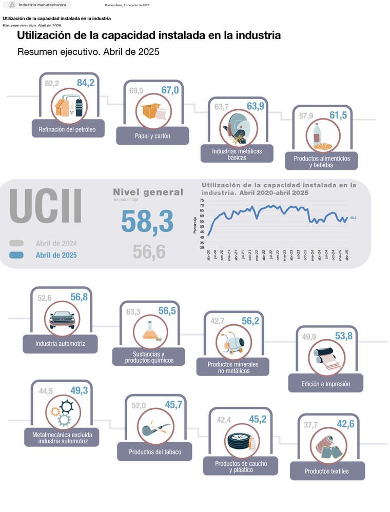 Foto: ShutterstockLa utilización de capacidad instalada en la industria se ubicó en 58,3% en abril, por arriba del mismo mes de 2024, cuando fue de 56,6%, de acuerdo con lo informado por el Instituto Nacional de Estadística y Censos (Indec). También mejoró respecto del 54,4% que se había registrado en marzo.