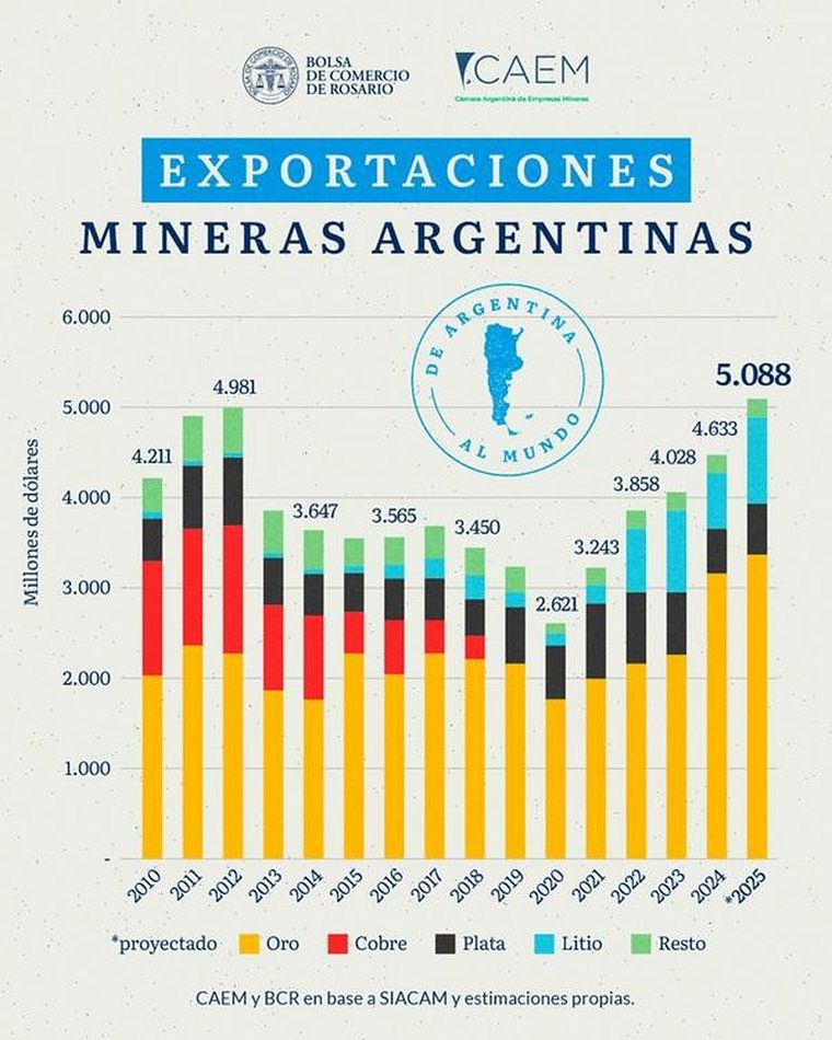 De concretarse el conjunto de proyectos mineros en el país, las exportaciones podrían ascender a US$ 19.200 millones hacia 2030, según un informe elaborado por la Dirección Nacional de Promoción y Economía Minera del Ministerio de Economía, un paquete que ayudaría mucho a la tracción de divisas al país, aunque sin retenciones y con RIGI, habrá que asegurar algo de reinversión de las ganancias para que generen, además, riqueza para los argentinos.