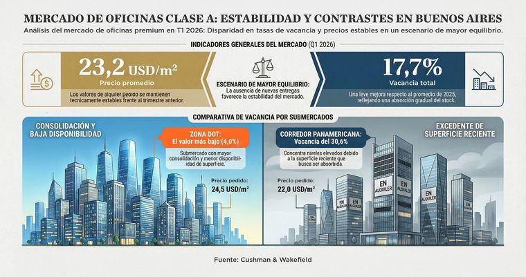 Foto: MDZEl mercado de oficinas premium de la Ciudad de Buenos Aires inició 2026 con una demanda mas acotada y selectiva aunque aún se mantiene activa. Según el último informe Market Beat de Cushman & Wakefield en un escenario sin superficie nueva, se visualiza mayor equilibrio tras el dinamismo observado hacia fines de 2025.