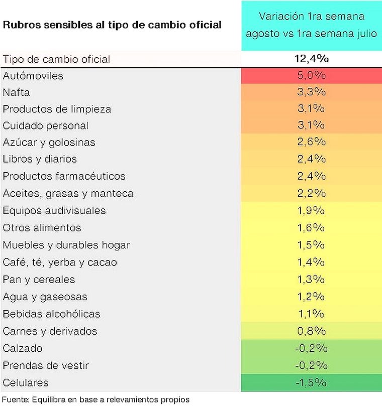 Según el informe de Analytica "si comparamos la variación punta a punta entre la primera semana de agosto y la primera de julio de los diferentes rubros afectados por el alza del tipo de cambio oficial, que fue del 12,4% en el periodo, se ve un traslado a precios acotado y heterogéneo".