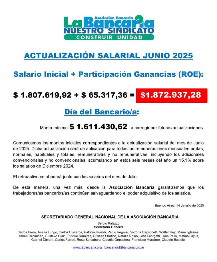 De esta manera, el ingreso inicial pasará de $1.752.653,20 hasta los $1.807.619,92. El incremento se abonará de manera retroactiva con el sueldo de julio. Además, la participación por ganancias (ROE) se ubica en $65.317,36. El súper bono por el Día del Bancario (4 de noviembre) ascenderá a $1.611.430,62.