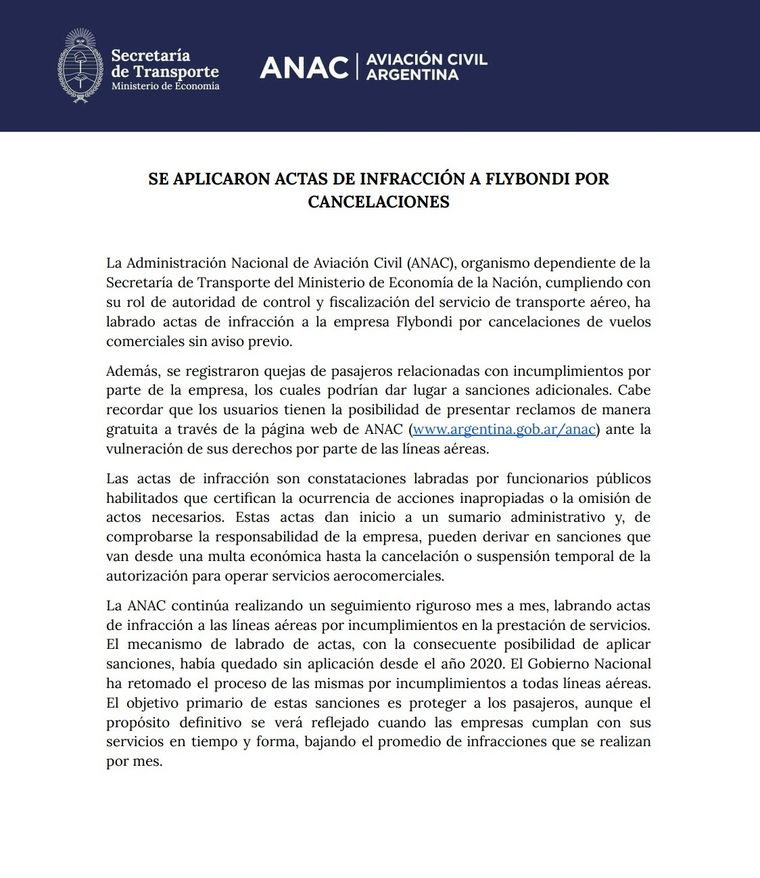 Desde el organismo remarcaron que “la ANAC continúa realizando un seguimiento riguroso mes a mes, labrando actas de infracción a las líneas aéreas por incumplimientos en la prestación de servicios”, y señalaron que este mecanismo sancionatorio había quedado prácticamente sin aplicación desde el año 2020. “El Gobierno Nacional ha retomado el proceso de sanciones por incumplimientos a todas las líneas aéreas”, agregaron.