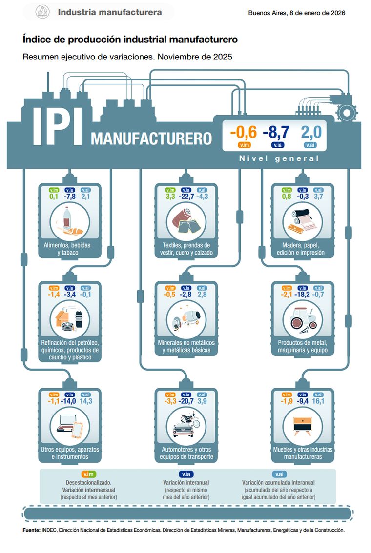 Según el organismo oficial, el Índice de Producción Industrial Manufacturero (IPI manufacturero) registró una baja interanual de 8,7%, con una baja del 0,6% en la comparación mensual desestacionalizada respecto de octubre.
