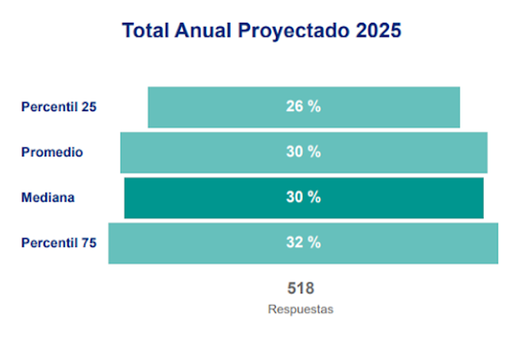 De acuerdo con los resultados, la mediana del presupuesto anual de incrementos salariales para 2025 se ubica en 30%, alineándose con la proyección de inflación estimada por Latin Focus, que fue del 29,7%. En tanto, las empresas relevadas prevén la inflación en línea, lo que evidencia un escenario de prudencia y planificación salarial cautelosa frente a un entorno económico todavía incierto. El informe señala que las subsidiarias internacionales proyectan incrementos mayores (30%) que las empresas con casa matriz en Argentina (28%).