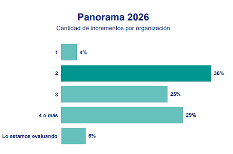 En cuanto a la frecuencia, el 34% de las empresas planea finalizar 2025 habiendo aplicado cuatro incrementos, lo que confirma la tendencia de fragmentar los aumentos para acompañar la evolución de los precios. En 2026, la mayoría de las empresas esperan realizar dos incrementos durante el año (36%), mientras que el 29% planea hacer cuatro o más.