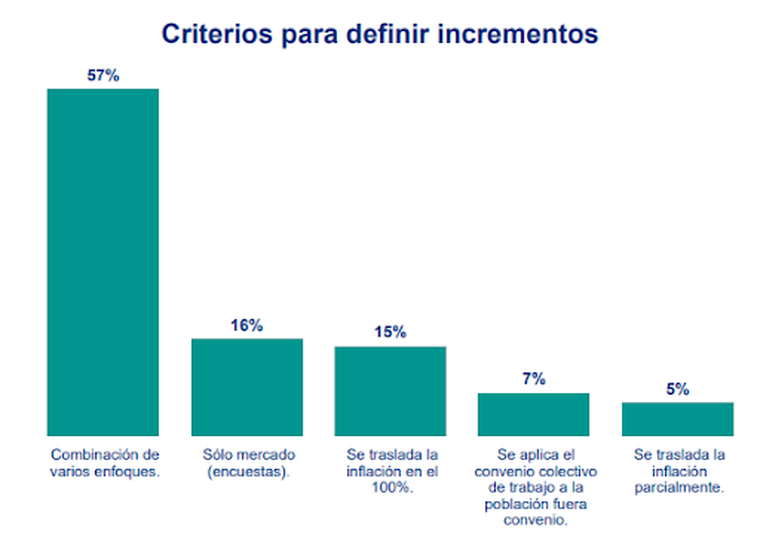 El informe señala que el 57% de las organizaciones combina múltiples criterios para analizar los incrementos, tales como referencias de mercado, inflación esperada y desempeño, mientras que un 16% se basa exclusivamente en encuestas de mercado y solo un 15% traslada directamente la inflación en su totalidad las subsidiarias internacionales proyectan incrementos mayores (30%) que las empresas con casa matriz en Argentina (28%).