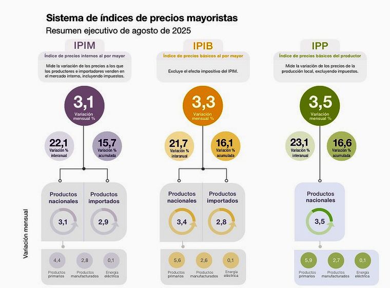 EFEEn agosto de 2025, los precios mayoristas mostraron una fuerte aceleración. Según los datos difundidos por el Instituto Nacional de Estadística y Censos (Indec), el Índice de Precios Internos al por Mayor (IPIM) registró una suba mensual de 3,1% respecto de julio, impulsada por aumentos del 3,1% en los productos nacionales y del 2,9% en los importados.
