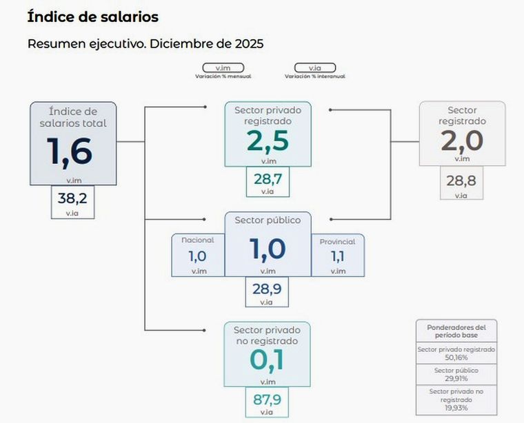 Archivo MDZEl índice de salarios que elabora el Instituto Nacional de Estadística y Censos (Indec) registró en diciembre de 2025 un incremento mensual del 1,6%, muy por debajo de lo que marcó la inflación en ese mes que fue del 2,8%. Aún así el incremento promedio salarial para todo el 2025 fue del 38,2%, superando por 7 puntos porcentuales la inflación anual (fue del 31,5%).