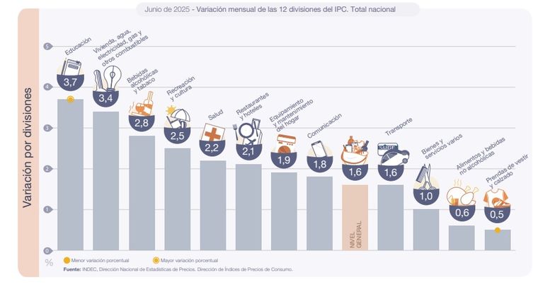 Las dos divisiones que registraron las menores variaciones en junio de 2025 fueron la siempre clave Alimentos y bebidas no alcohólicas con un 0,6% y Prendas de vestir y calzado con un 0,5%.