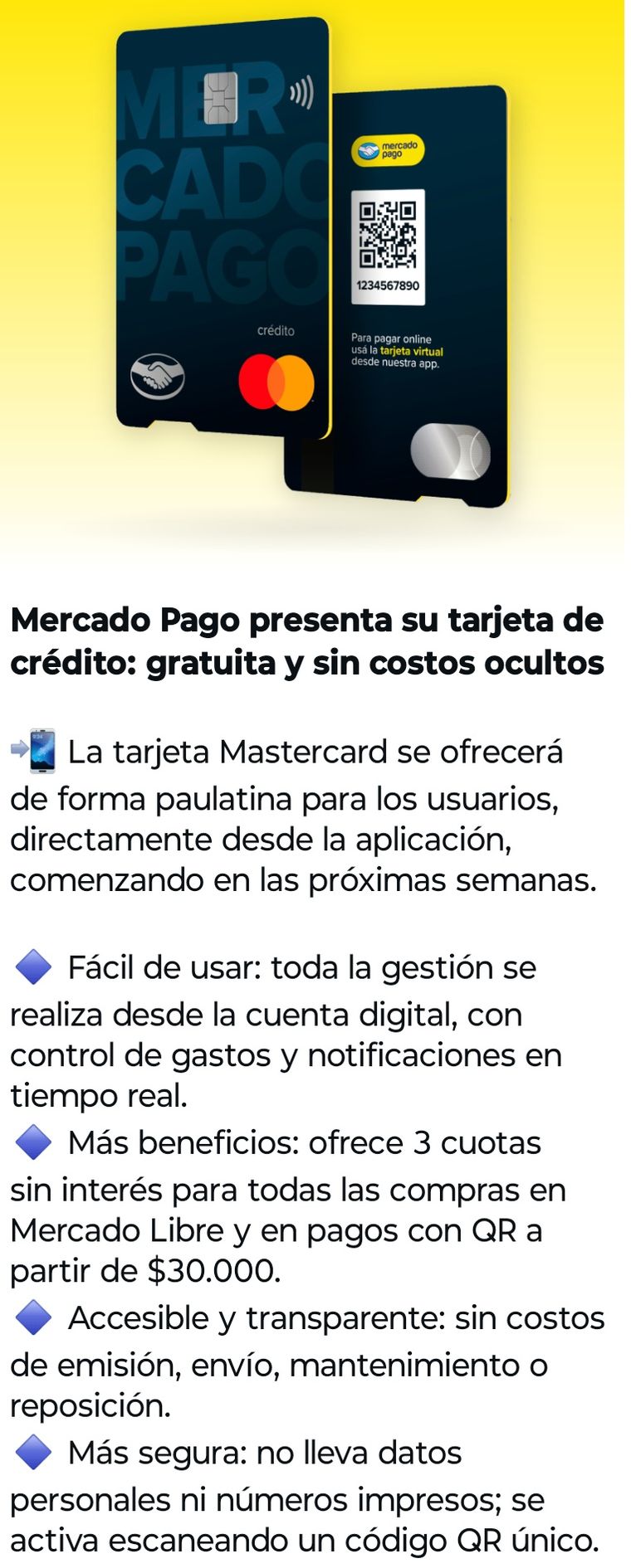 El nuevo producto se destaca por no tener costos de emisión ni de mantenimiento, y además permite realizar compras en hasta tres cuotas sin interés en Mercado Libre, así como en otros comercios asociados.