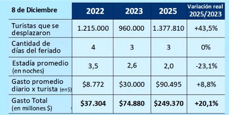 El movimiento turístico por el Día de la Inmaculada Concepción mostró un desempeño sólido pese al clima inestable y a los pronósticos de tormentas que afectaron algunas decisiones de viaje. De acuerdo con datos de la Confederación Argentina de la Mediana Empresa (CAME), 1.377.810 turistas se desplazaron por distintos destinos del país.