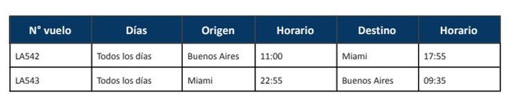 Los horarios del tramo diario acompañan la búsqueda de eficiencia: el vuelo LA542 parte cada mañana desde Buenos Aires rumbo a Miami, mientras que el LA543 realiza el regreso durante la noche. Esta dinámica facilita empalmes con otros aeropuertos del país norteamericano, optimizando el tiempo de estadía o los enlaces hacia nuevas rutas.