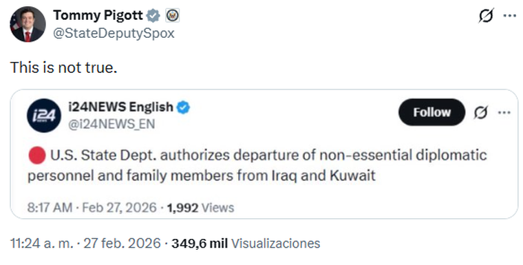 "Esto no es cierto", aseguró en X el viceportavoz del Departamento de Estado, Tommy Pigott, al reaccionar a una publicación del medio israelí i24News que informaba sobre la aprobación de salida a diplomáticos y sus familias de sus misiones en esos países árabes en medio de las tensiones en la región por un posible ataque de EE.UU. a Irán.