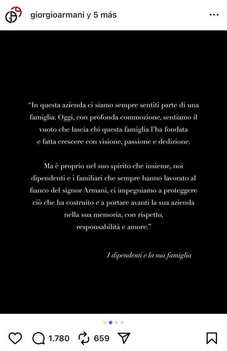 "Con infinito pesar, el grupo Armani anuncia el fallecimiento de su creador, fundador e incansable motor: Giorgio Armani. El señor Armani, como siempre le han llamado con respeto y admiración sus empleados y colaboradores, falleció tranquilamente, rodeado de sus seres queridos. Incansable, trabajó hasta sus últimos días, dedicándose a la empresa, a las colecciones y a los diversos y siempre nuevos proyectos en curso y en desarrollo", comunicó la casa de moda.