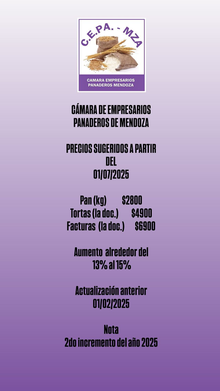 El precio del pan aumenta entre un 13 y un 15% a partir del próximo martes 1 de julio. El kilo de pan pasará a costar $2.800 y el de tortas (la docena) $4.900. Por su parte, la docena de factura se venderá a 6.900 pesos la docena. Es el segundo incremento en el 2025.