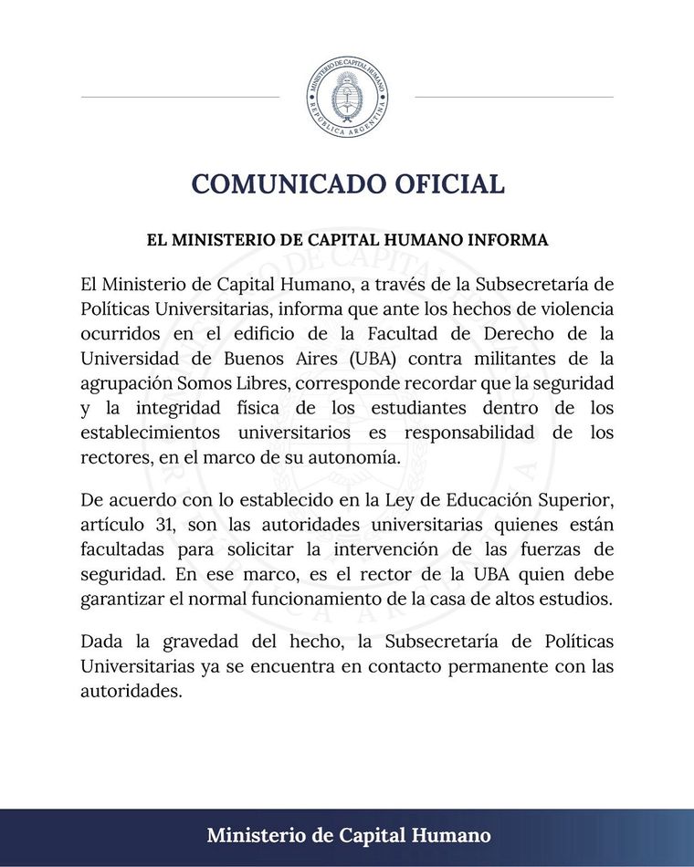 Ante la difusión del hecho, el Ministerio de Capital Humano emitió un comunicado oficial a través de la Subsecretaría de Políticas Universitarias, en el que recordó que la seguridad y la integridad física de los estudiantes dentro de los establecimientos universitarios es responsabilidad de los rectores, en el marco de la autonomía universitaria.