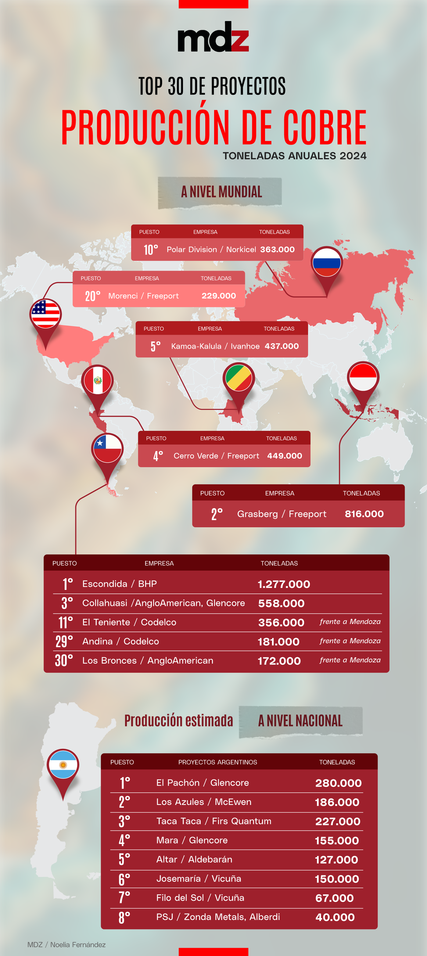 Una ventaja a la hora de intentar dimensionar en qué lugar del mundo del cobre puede llegar a estar Mendoza y la Argentina, es que tenemos de vecino al mayor productor del metal rojo en el mundo, lo que permite tener un parámetro muy cercano. De hecho, en el ranking de las minas que más producen a nivel mundial, Chile alberga a Minera Escondida, la joya de la corona operada por BHP, que en 2024 alcanzó una producción anual 1,27 millones de toneladas y es la que mayor producción alcanza a nivel mundial. Con su nivel de producción es 30 veces mayor a la producción estimada de PSJ.