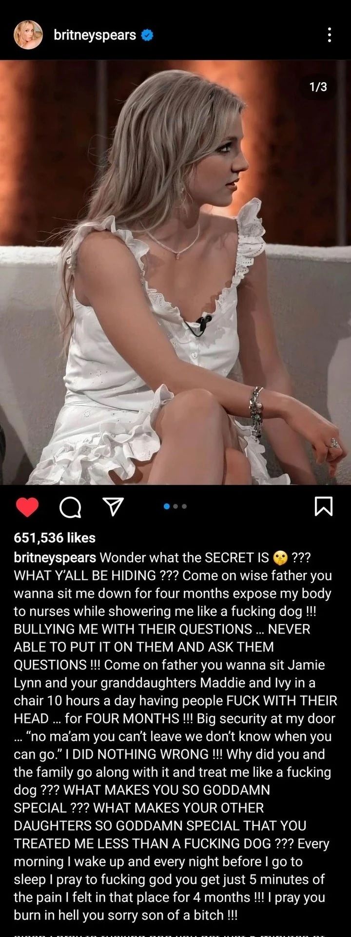 Y remató, fuerte y con toda la vehemencia, sin guardarse nada: “¡Todas las mañanas me despierto y cada noche antes de irme a dormir le rezo a Dios para que recibas solo 5 minutos del dolor que sentí en ese lugar durante 4 meses! ¡Rezo para que te quemes en el infierno, hijo de put...!”. Britney borró la publicación luego, pero ya varios habían tomado una captura de ese durísimo descargo.
