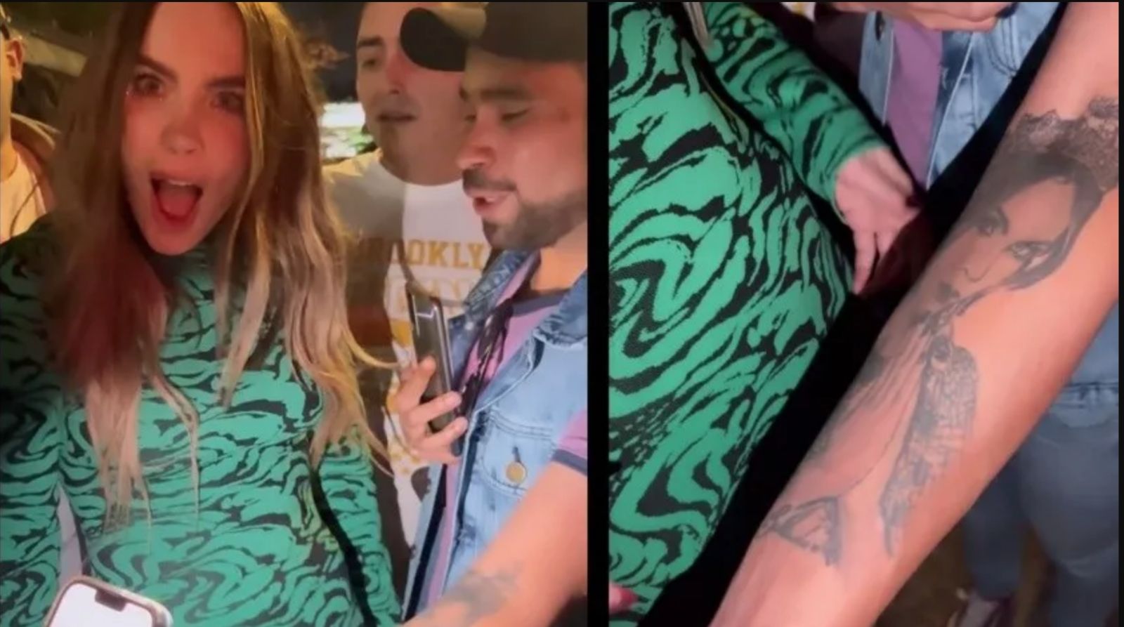 En ese contexto uno de sus fans le mostró un brazo y ¡oh!, la figura no pudo más que quedar con la boca abierta por la sorpresa: el tatuaje que eligió este fanático para homenajearla es una imagen suya vestida como santa y con las manos unidas en un rezo. No es la primera vez que el seguidor tiene contacto con su ídola ya que una vez lo había saludado con un beso.