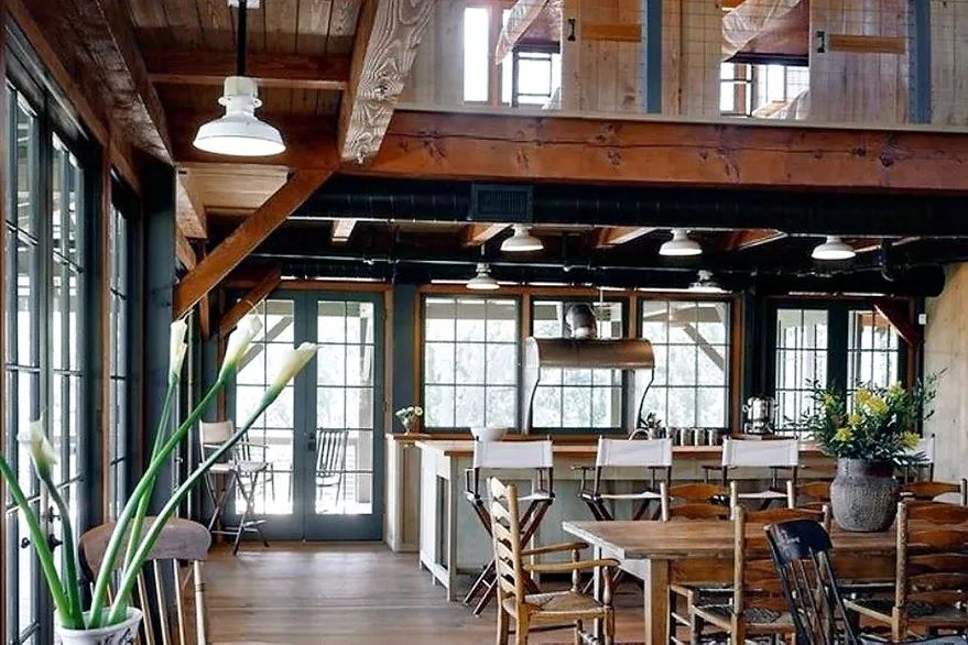 Antes de ingresar a la propiedad, existe un hermoso pórtico de madera con sillas de descanso al que se llega después de un cuidadoso camino de baldosas bien confeccionado, ideal para una recepción. Por dentro, el piso es en su mayoría de madera de pino y la sala de estar está enmarcada por una gran chimenea arqueada, típica del estilo arquitectónico. Si hay algo que la caracteriza son sus enormes ventanales, un detalle muy bien acentuado para poder apreciar la luz del día.