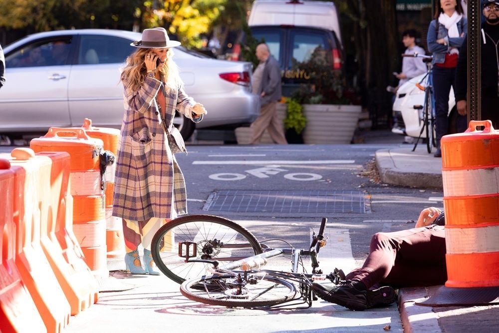 Una de las más comentadas fue la que protagonizó Parker en una escena que filmó junto a Davis. Las actrices fueron retratadas llevando al bulldog de Charlotte en la entrada del apartamento de Carrie, ubicado en el West Village. Lo cierto es que durante estas tomas, por estar más atenta a su celular que a lo que sucede en la calle, el personaje de Parker casi es atropellado por un hombre que pasaba en bicicleta.