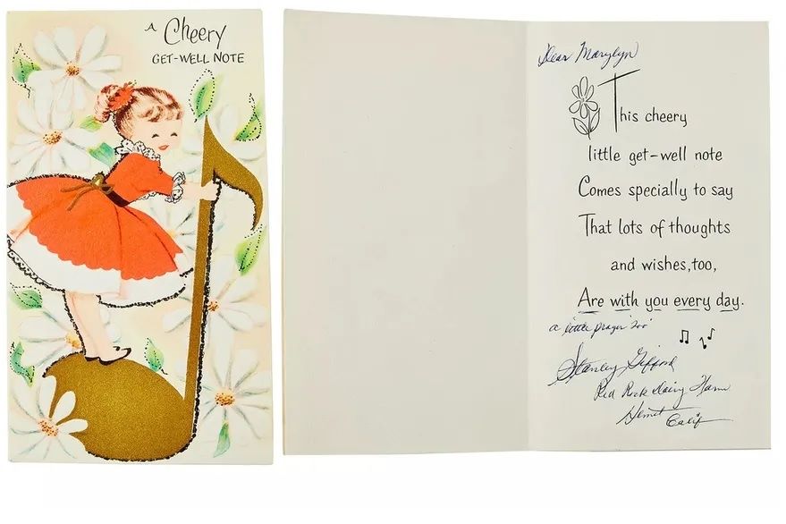 Según estiman, la tarjeta se venderá entre 2 mil y 3 mil dólares de piso, y dentro de sus características físicas tiene un diseño infantil con una niña parada sobre una nota musical en la portada. Dentro, lleva el mensaje de Glifford. “Querida Marilyn. Esta pequeña y alegre nota de recuperación viene especialmente para decir que muchos de mis pensamientos y buenos deseos también están contigo todos los días. Una pequeña oración, también”.