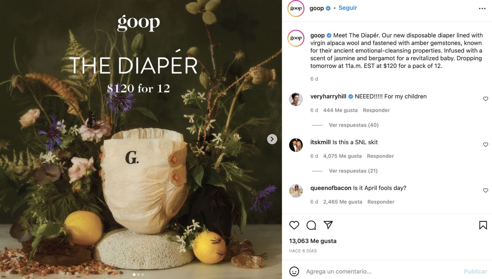 El valor de un paquete de 12 pañales descartables es de 120 dólares, algo que fue lo más criticado en redes sociales. Muchos usuarios desde la cuenta de Instagram de Goop pensaban que se trataba de una broma o de un sketch del famosos programa Saturday Night Live y otros remarcaban una falta de respecto al tratarse de un producto de primera necesidad.