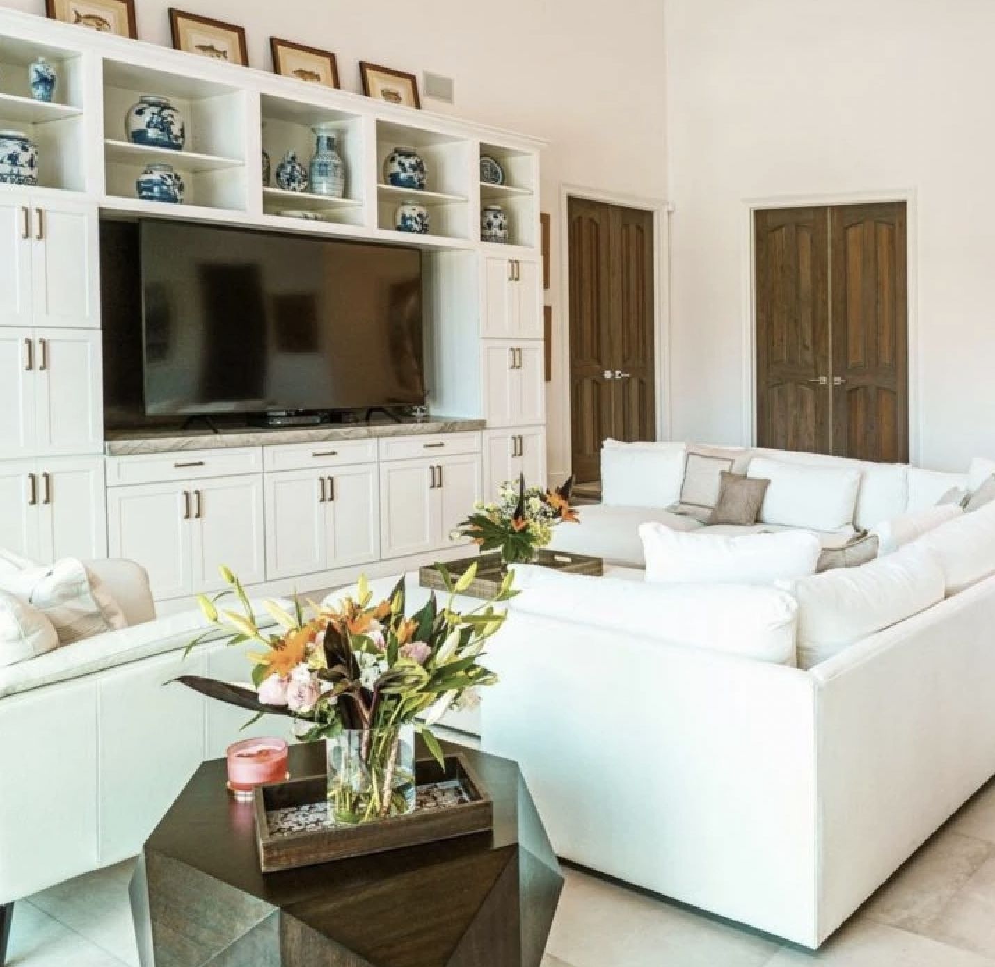 La mansión de Chábeli tiene una increíble vista al mar, una decoración clásica con el toque justo de modernidad que la hace única, con alfombras y tapizados en tonos claros. Además, varios espacios de relajación y disfrute al aire libre, con sillones y almohadones combinando el beige con el naranja.