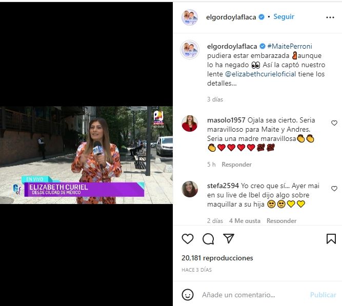 Por su parte, la reportera del programa, Elizabeth Curiel, aseguró que, a su parecer, Maite Perroni podría estar de unos avanzados meses de gestación. Es más, se escuchó decir: “La ex RBD luce con algunos kilitos de más y cualquiera podría asegurar que está en la dulce espera. Según rumores de fuentes allegadas la actriz pudiera tener entre 5 y 6 meses de embarazo”.