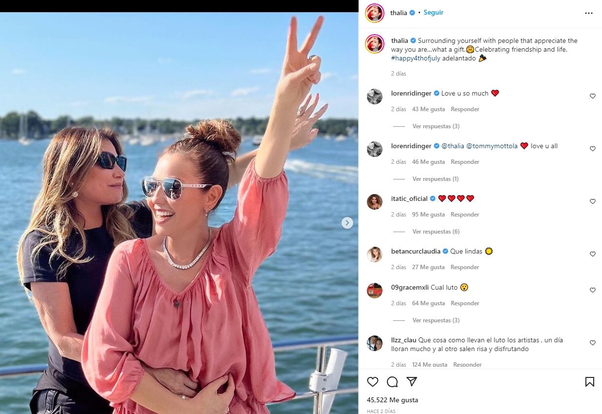 En dicha publicación, Thalía escribió junto a una serie de videos y fotografías en las que se la veía sonriente junto a su familia: “Rodearte de personas que aprecien tu forma de ser… qué regalo celebrar la amistad y la vida. Feliz 4 de julio adelantado”.