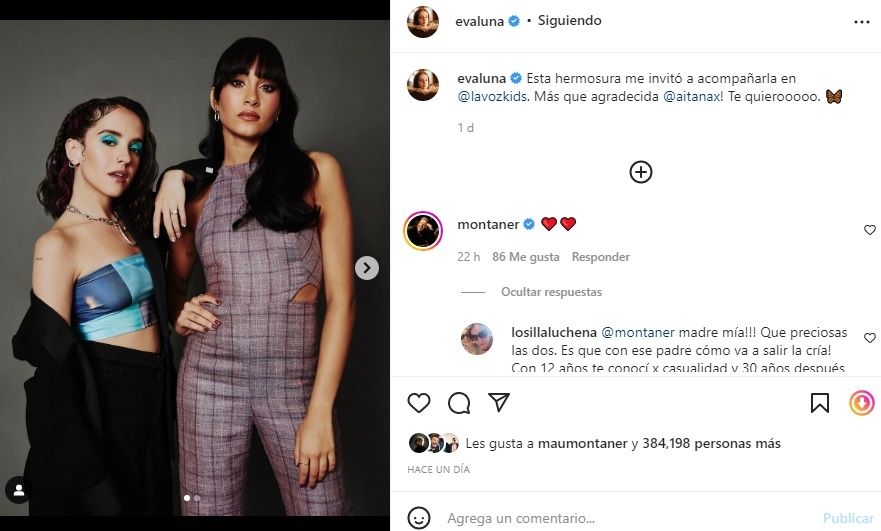 Esta noticia fue compartida en su perfil de su cuenta oficial de Instagram con un par de fotos y un mensaje que dice: "Esta hermosura me invitó a acompañarla en @lavozkids. Más que agradecida @aitanax! Te quierooooo". Este posteo tuvo miles de reacciones y mensajes. Entre ellos se encuentra el de su padre que le dedicó emoticones de corazones.