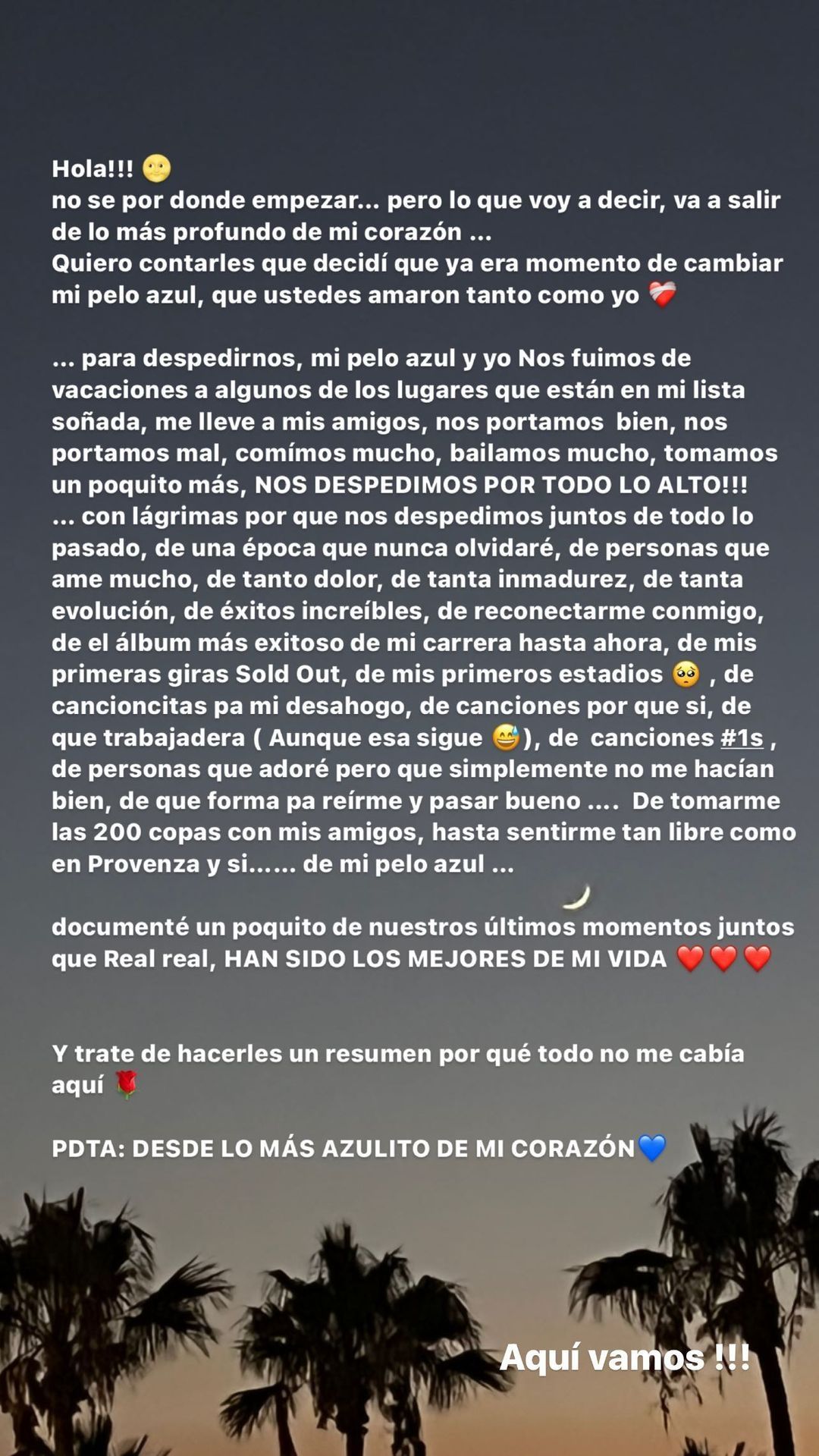 El extenso anunció que publicó Karol G para despedirse de los azules de sus pelos continuó así: "... Con lágrimas porque nos despedimos juntos de todo lo pasado, de una época que nunca olvidaré, de personas que ame mucho, de tanto dolor, de tanta inmadurez, de tanta evolución, de éxitos increíbles, de reconectarme conmigo, de el álbum más exitoso de mi carrera hasta ahora, de mis primeras giras Sold Out, de mis primeros estadios, de cancioncitas pa mi desahogo, de canciones por que si, de personas que adoré pero que simplemente no me hacían, las 200 copas con mis amigos, hasta sentirme tan libre como en Provenza y si... de mi pelo azul...".