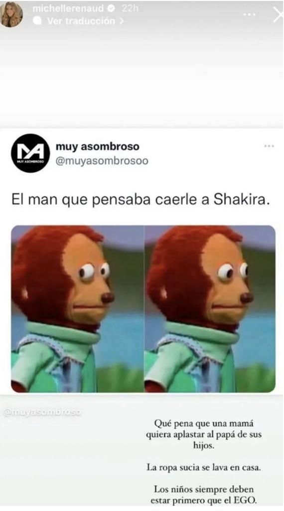 Y es que la protagonista de la telenovela “La Herencia” publicó en una de sus historias de Instagram un meme de un muñeco con cara de asombro que decía “El hombre que quiere caerle (conquistar) a Shakira”. Acompañando la imagen, la actriz colocó un escrito donde claramente deja ver que está en contra de la colombiana. "Que pena que una mamá quiera aplastar al papá de sus hijos. La ropa sucia se lava en casa. Los hijos deben estar primero que el ego", escribió Michelle.