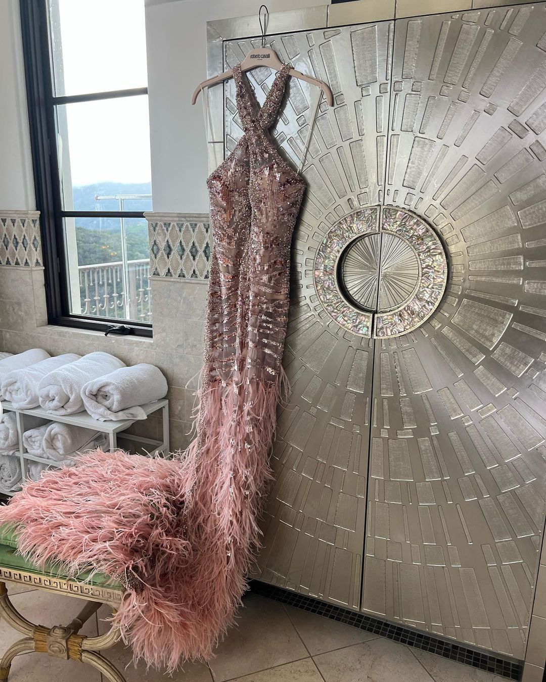 La actriz deslumbró a todos al lucir un espectacular vestido de transparencias de Roberto Cavalli. La prenda de malla tenía cuello halter, escote al centro, plumas y múltiples lentejuelas doradas bordadas para dar toques destellantes al atuendo.