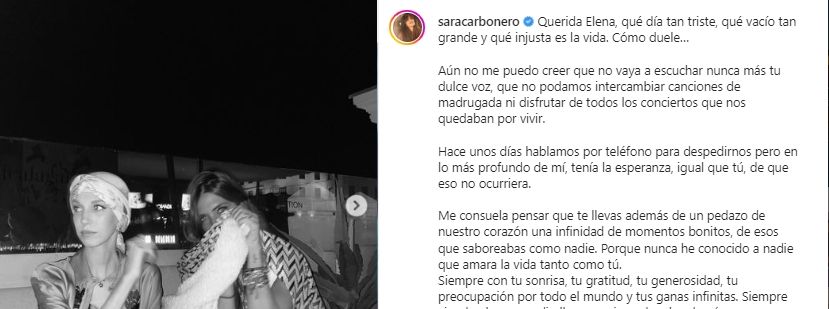 Otra que utilizó sus redes para despedirse fue la periodista Sara Carbonero, quien además de aprovechar para revivir momentos junto a Elena Huelva, también recordó su última plática: “Hace unos días hablamos por teléfono para despedirnos, pero en lo más profundo de mí, tenía la esperanza, igual que tú, de que eso no ocurriera”.