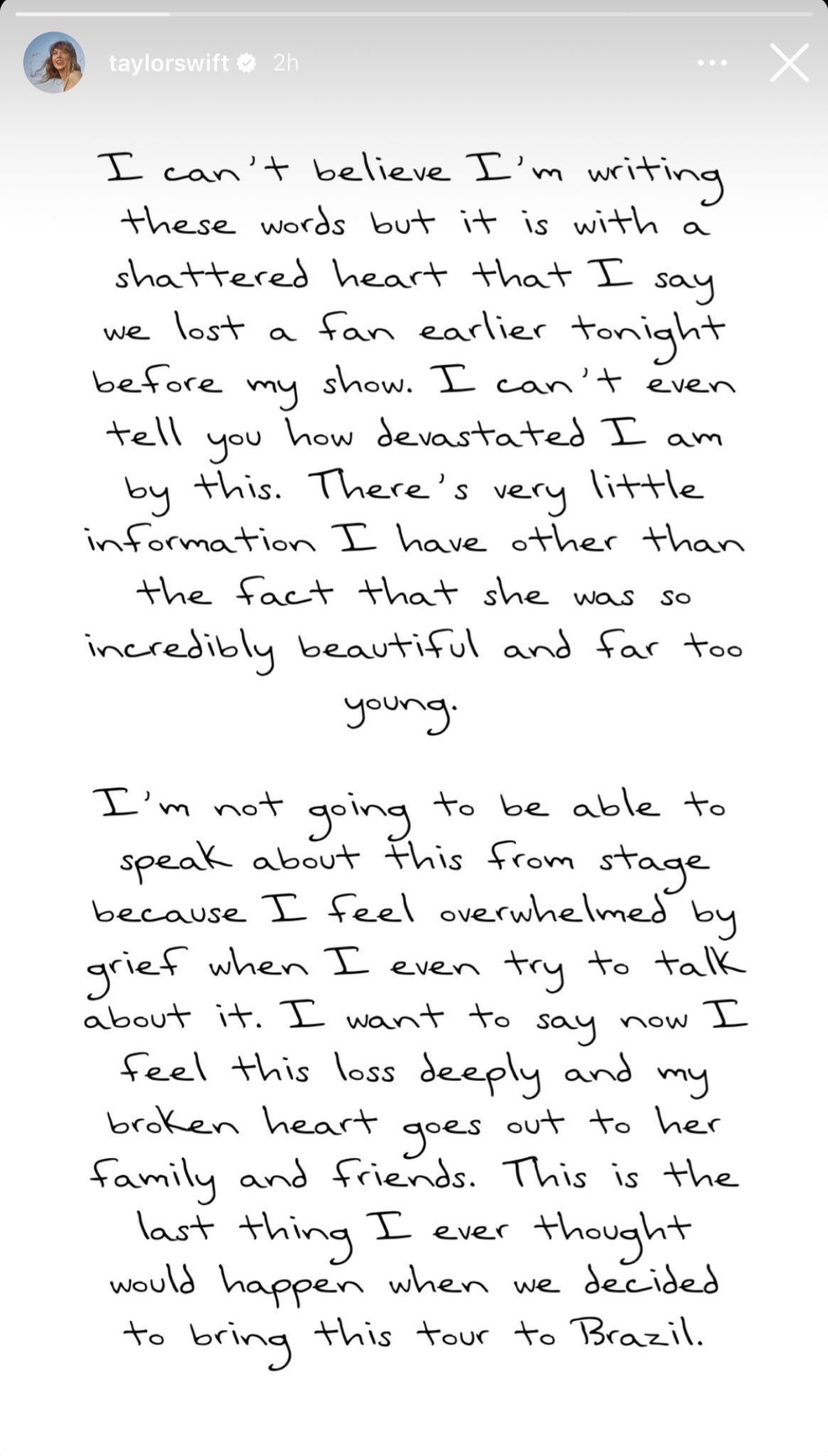 Tras la muerte de su fan, Taylor Swift envió un conmovedor mensaje. Foto: Instagram/ Taylor Swift