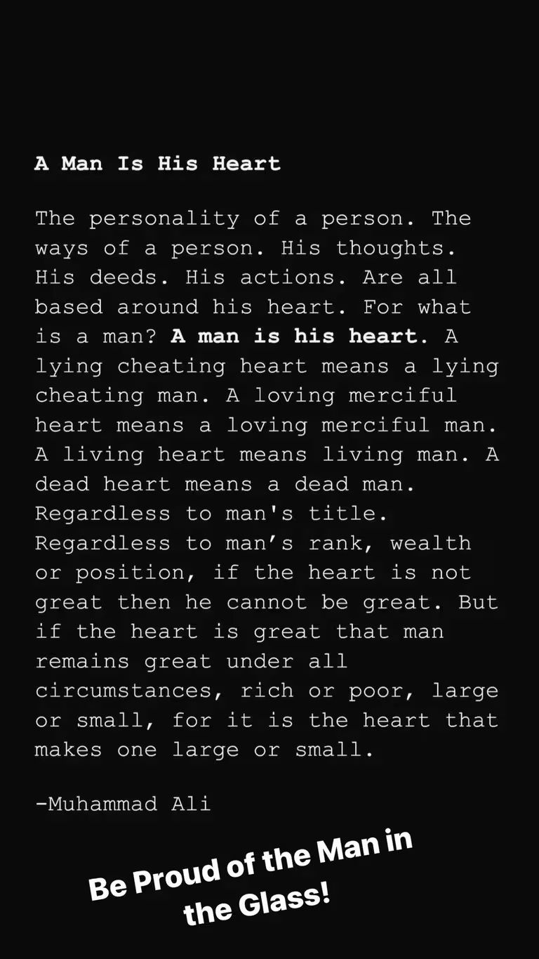 ¿Qué dice el posteo que compartió? "La personalidad de un hombre. Los caminos de un hombre. Sus pensamientos. Sus hechos. Sus acciones. Todos se basan en su corazón. ¿Para qué es un hombre? Un hombre es su corazón", comienza detallando.