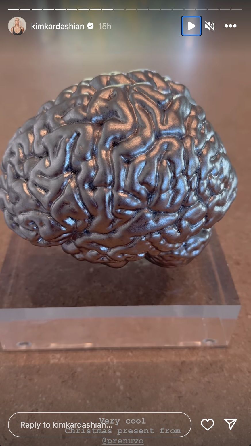 La fundadora de SKIMS mostró su regalo a sus seguidores en Instagram, colocándolo en el mostrador de su casa y explicó por qué lo había recibido por correo. "Entonces, ¡qué genial es esto! La gente de Prenuvo me hizo una escultura de mi cerebro. Esto es como mi cerebro real", dijo.