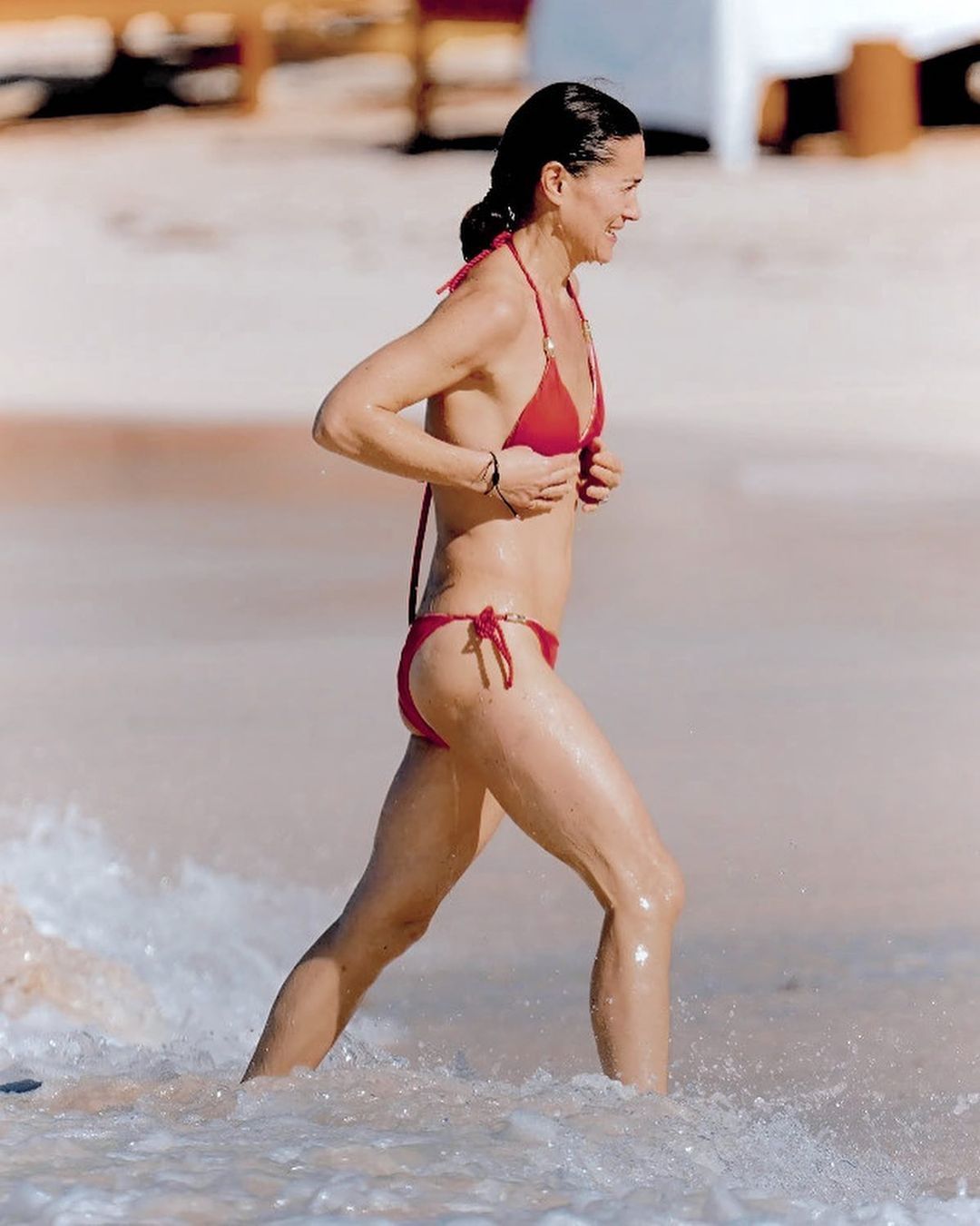 En el carrete de fotos que publicó la propia famosa en su cuenta de Instagram se la puede apreciar luciendo un bikini reversible de la firma Heidi Klein, conjunto que enmarca su trabajada silueta.