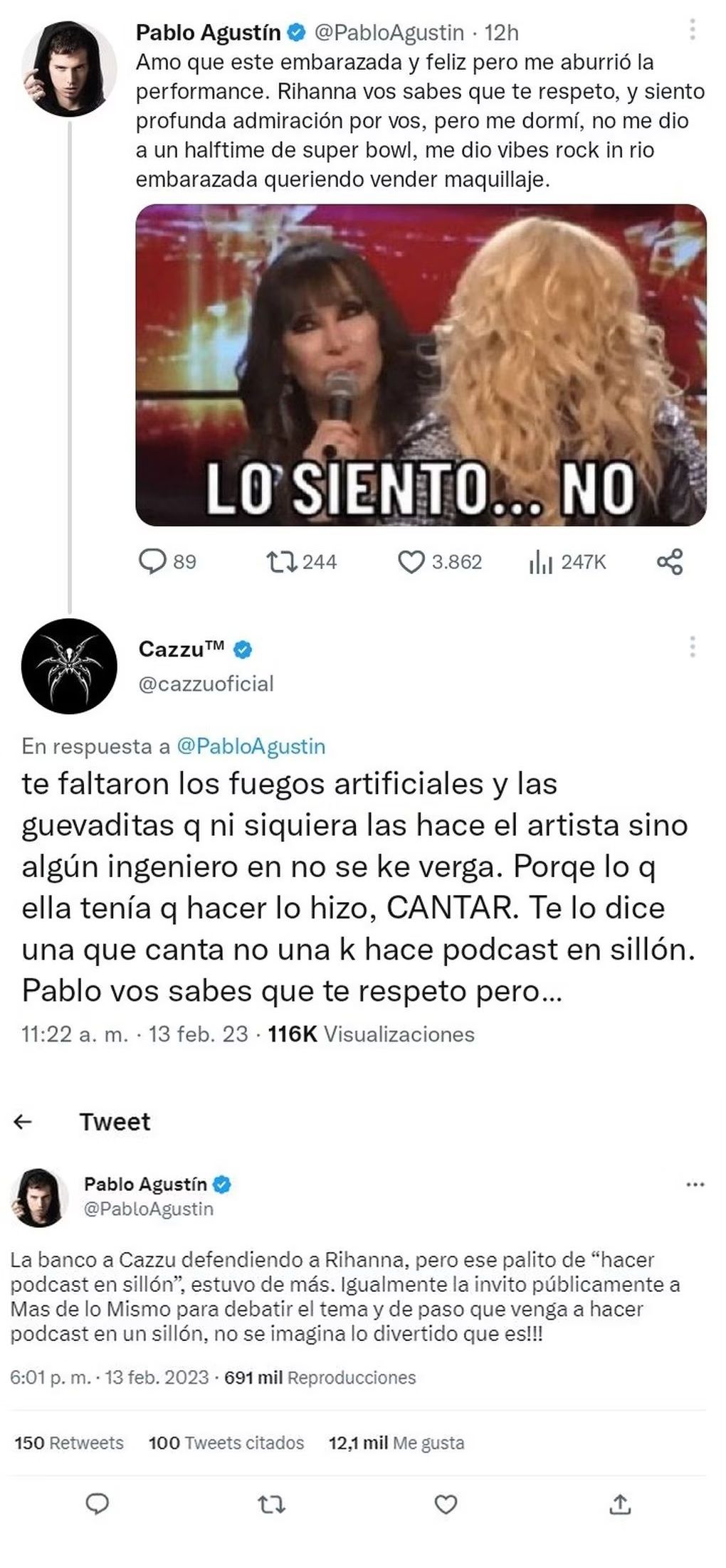 Lejos de detenerse ahí, el cruce siguió y el youtuber le respondió: “La banco a Cazzu defendiendo a Rihanna, pero ese palito de 'hacer podcast en sillón', estuvo de más. Igualmente la invito públicamente a Mas de lo Mismo para debatir el tema y de paso que venga a hacer podcast en un sillón, no se imagina lo divertido que es!!!”.