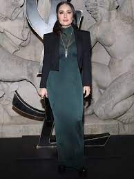 La protagonista de Frida, Salma Hayek, lució un vestido largo y transparente en color verde esmeralda, para asistir al desfile Otoño-Invierno 2023 de dicha casa de modas. Lo complementó con un blazer corto y botas de plataforma en color negro.